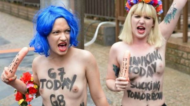 Παρότι ο πρόεδρος της Ρωσίας έμεινε εκτός των συνομιλιών, ως απάντηση στην επέμβαση του ρωσικού στρατού στην Κριμαία, οι ακτιβίστριες της οργάνωσης δε συγκρατήθηκαν και εξέφρασαν για μία ακόμη φορά την οργή τους στο πρόσωπό του.