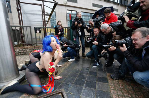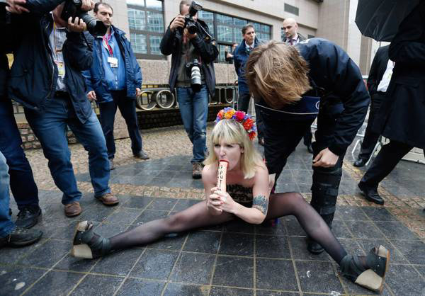 Οι FEMEN ξαναχτύπησαν έξω από κτίριο του Ευρωπαϊκού Συμβουλίου στις Βρυξέλλες την ώρα που οι εκπρόσωποι των επτά ισχυρότερων βιομηχανικών κρατών του κόσμου συνεδρίαζαν για θέματα εξωτερικής πολιτικής και οικονομίας, χωρίς την παρουσία του Ρώσου προέδρου, Βλάντιμιρ Πούτιν.