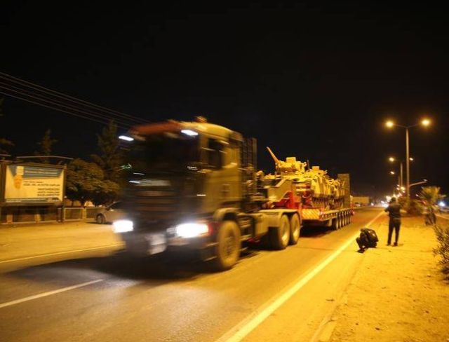 Φωτογραφίες και βίντεο που αναρτήθηκαν στο Twitter το βράδυ του Σαββάτου δείχνουν τουρκικά τεθωρακισμένα να φτάνουν στην επαρχία Χατάι με τρένα και νταλίκες.