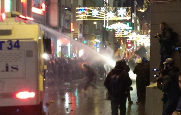 Στη συνέχεια οι αστυνομικοί επιτέθηκαν στους διαδηλωτές με τη βοήθεια κανονιών νερού. Συνολικά πέντε αύρες συμμετείχαν στην επιχείρηση καταστολής, εδώ βλέπετε μία να κινείται μαζί με τη διμοιρία των τουρκικών ΜΑΤ.