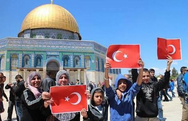 Παλαιστίνιοι πανηγυρίζουν κρατώντας τουρκικές σημαίες μπροστά στον Θόλο του Βράχου στα Ιεροσόλυμα, εκεί που ήταν χτισμένος στην αρχαιότητα ο Ναός των Εβραίων. Οι Παλαιστίνιοι ισλαμιστές θεωρούν τον Ρετζέπ Ταγίπ Ερντογάν προστάτη και αφέντη τους.