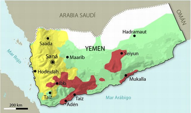 Πολεμικός χάρτης της Υεμένης: Με κίτρινο χρώμα τα εδάφη που ελέγχουν οι αντάρτικες παρατάξεις. Με πράσινο χρώμα οι φιλοσαουδαραβικές δυνάμεις και με μπορντό χρώμα η Αλ Κάιντα. Με άσπρο είναι η έρημος.