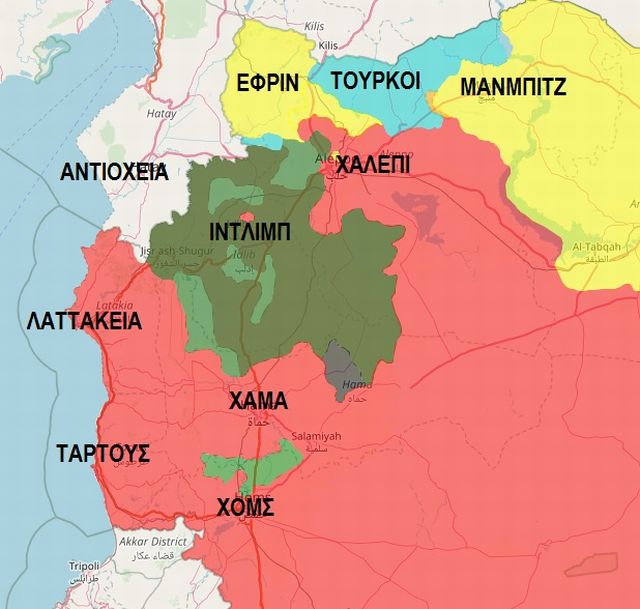 Πολεμικός χάρτης της βορειοδυτικής Συρίας: Με κόκκινο χρώμα τα εδάφη που ελέγχει η κυβέρνηση. Με πράσινο ανοιχτό φιλότουρκοι ισλαμιστές. Με πράσινο σκούρο η συριακή Αλ Κάιντα, η Ταχρίρ Αλ Σαμ. Με κίτρινο οι Κούρδοι και με γαλάζιο οι περιοχές υπό τουρκική κατοχή. Με μαύρο χρώμα ο θύλακας της οργάνωσης Ισλαμικό Κράτος που εμφανίστηκε τις τελευταίες εβδομάδες στην περιοχή σε εδάφη που προηγουμένως έλεγχε η Αλ Κάιντα.