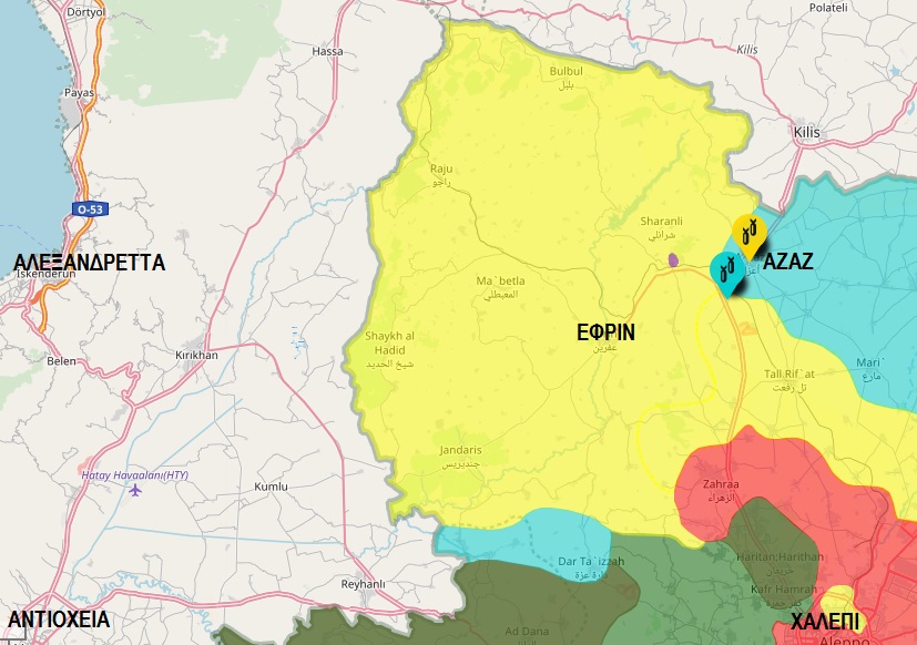 Πολεμικός χάρτης της Εφρίν: Με κίτρινο χρώμα το κουρδικό καντόνι της Εφρίν. Με γαλάζιο τα συριακά εδάφη υπό τουρκική κατοχή. Με πράσινο σκούρο η Αλ Κάιντα, με πράσινο ανοιχτό «μετριοπαθείς» ισλαμιστές. Με κόκκινο η συριακή κυβέρνηση. Οι σημειωμένες κίτρινες βόμβες δείχνουν την Αζάζ, που τη βομβάρδισαν οι Κούρδοι και οι γαλάζιες βόμβες τη Μαρανάζ που βομβάρδισαν οι Τούρκοι.