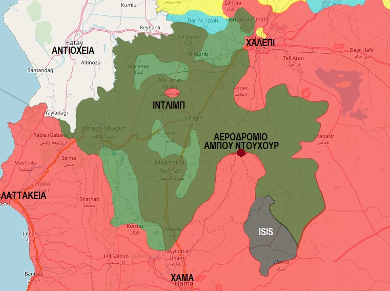 Πολεμικός χάρτης της Ιντλίμπ. Με κόκκινο τα εδάφη υπό κυβερνητικό έλεγχο, με σκούρο πράσινο η Αλ Κάιντα, με ανοιχτό πράσινο άλλες ισλαμιστικές οργανώσεις, με κίτρινο οι Κούρδοι και με γαλάζιο τα εδάφη υπό τουρκική κατοχή.