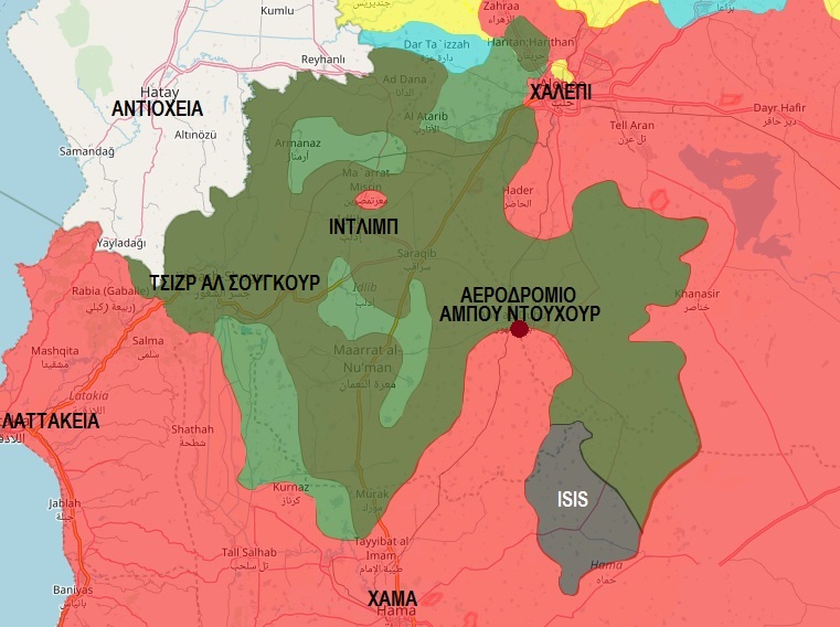 Πολεμικός χάρτης της Ιντλίμπ. Με κόκκινο τα εδάφη υπό κυβερνητικό έλεγχο, με σκούρο πράσινο η Αλ Κάιντα, με ανοιχτό πράσινο άλλες ισλαμιστικές οργανώσεις, με κίτρινο οι Κούρδοι και με γαλάζιο τα εδάφη υπό τουρκική κατοχή.