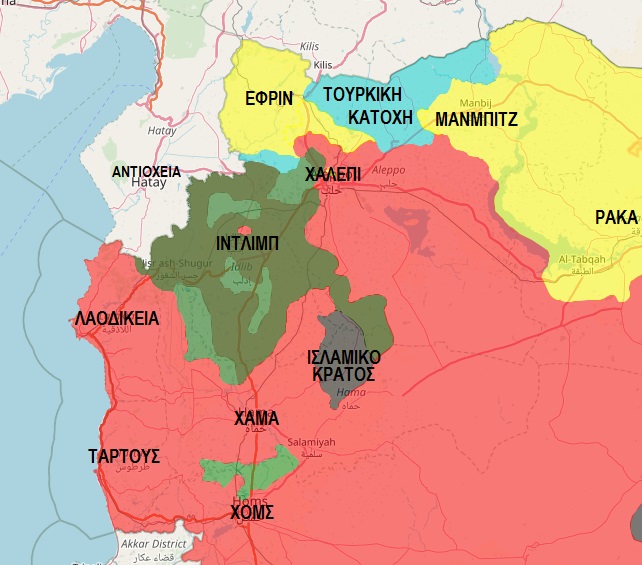 Με κόκκινο χρώμα τα εδάφη υπό κυβερνητικό έλεγχο. Με κίτρινο οι Κούρδοι. Με πράσινο ανοιχτό οι «μετριοπαθείς» ισλαμιστές και με σκούρο πράσινο η Αλ Κάιντα. Με γαλάζιο τα εδάφη υπό τουρκική κατοχή. Με μαύρο το Ισλαμικό Κράτος.