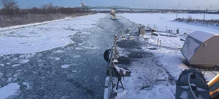 Ο λόγος για το USS Little Rock που εγκλωβίστηκε στους πάγους στο κανάλι του Μόντρεαλ κι ίσως χρειαστεί να περιμένει ολόκληρο το χειμώνα εκεί για να μπορέσει να αποπλεύσει.