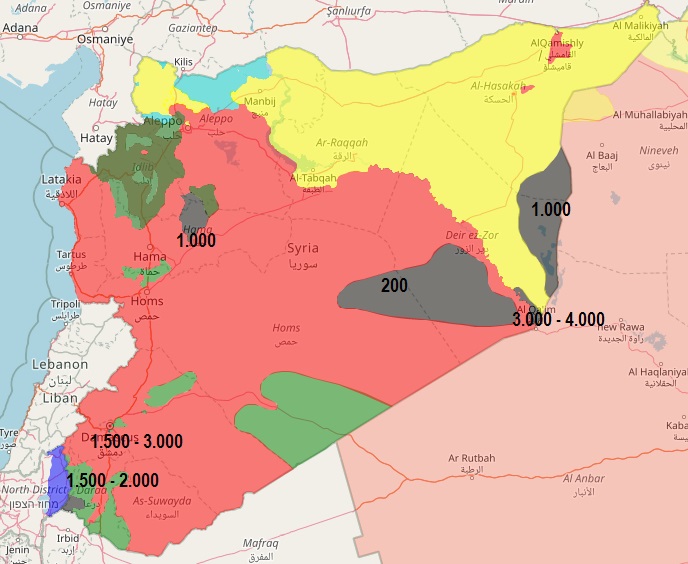 Σύμφωνα με εκτιμήσεις ξένων υπηρεσιών, το Ισλαμικό Κράτος έχει 1.500 με 2.000 άνδρες στην περιοχή του Γιάρμουκ, τουλάχιστον 1.000 στη βορειοδυτική Συρία, 1.500 με 2.000 στη νότια Δαμασκό (κάποια λένε ότι εκεί μπορεί να φτάνουν και τους 3.000), στην έρημο μεταξύ των επαρχιών Χομς και Ντέιρ Αλ Ζουρ περίπου 200, στην ανατολική όχθη του Ευφράτη ποταμού 3.000 με 4.000, στην έρημο της Ντέιρ Αλ Ζουρ κοντά στα ιρακινά σύνορα ακόμα 1.000.