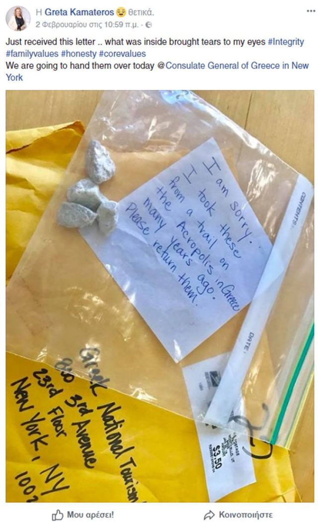 «Λυπάμαι. Τις πήρα από ένα μονοπάτι από την Ακρόπολη στην Ελλάδα πολλά χρόνια πριν. Σας παρακαλώ να τις επιστρέψετε».