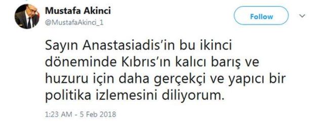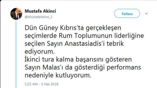 «Συγχαίρω τον κύριο Αναστασιάδη για την επανεκλογή του ως ηγέτης των Ελληνοκυπρίων στις χθεσινές εκλογές της νότιας Κύπρου. Επίσης, συγχαίρω τον κ. Μαλά για την προσπάθειά του στον δεύτερο γύρο», έγραψε ο Ακιντζί.