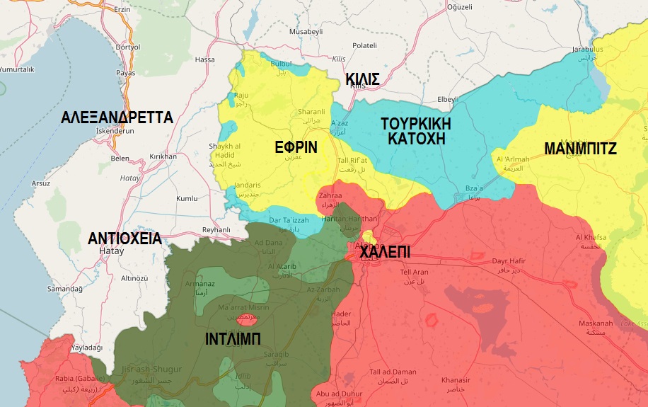 Πολεμικός χάρτης της βορειοδυτικής Συρίας: Με κίτρινο χρώμα τα εδάφη υπό κουρδικό έλεγχο, με γαλάζια τα εδάφη υπό τουρκική κατοχή ή τουρκικό έλεγχο, με κόκκινο τα εδάφη που ελέγχει η κυβέρνηση της Συρίας, με σκούρο πράσινο η Αλ Κάιντα και με ανοιχτό πράσινο οι «μετριοπαθείς» ισλαμιστές.