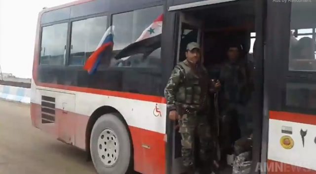 Τα λεωφορεία που μετέφεραν τους Σύρους παραστρατιωτικούς είχαν κρεμασμένη εκτός της συριακής και τη ρωσική σημαία.