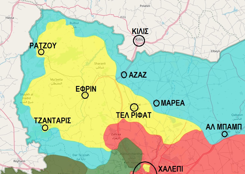 Πολεμικός χάρτης της Εφρίν στη βορειοδυτική Συρία. Με κίτρινο χρώμα είναι τα εδάφη που ελέγχουν οι Κούρδοι. Με γαλάζιο οι τουρκοκρατούμενες περιοχές. Με κόκκινο η συριακή κυβέρνηση και με πράσινο η Αλ Κάιντα και άλλες ισλαμιστικές οργανώσεις.