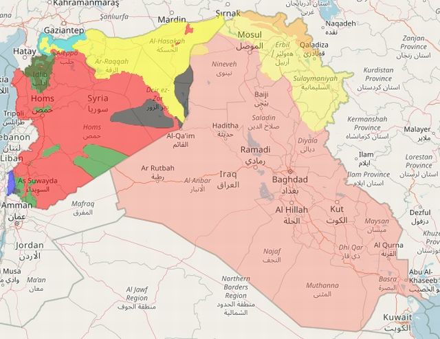 Πολεμικός χάρτης Συρίας-Ιράκ: Με μαύρο χρώμα απεικονίζονται τα εδάφη που ελέγχει το Ισλαμικό Κράτος. Με το κίτρινο σε όλες τις αποχρώσεις είναι τα εδάφη που κατέχουν οι Κούρδοι. Με κόκκινο είναι τα εδάφη που ελέγχει η συριακή κυβέρνηση και με ροζ η ιρακινή. Με πράσινο είναι ο Ελεύθερος Συριακός Στρατός (FSA) και άλλες ισλαμιστικές οργανώσεις. Με πράσινο σκούρο είναι η Αλ Κάιντα και με γαλάζιο τα υπό τουρκική κατοχή εδάφη στη Συρία.