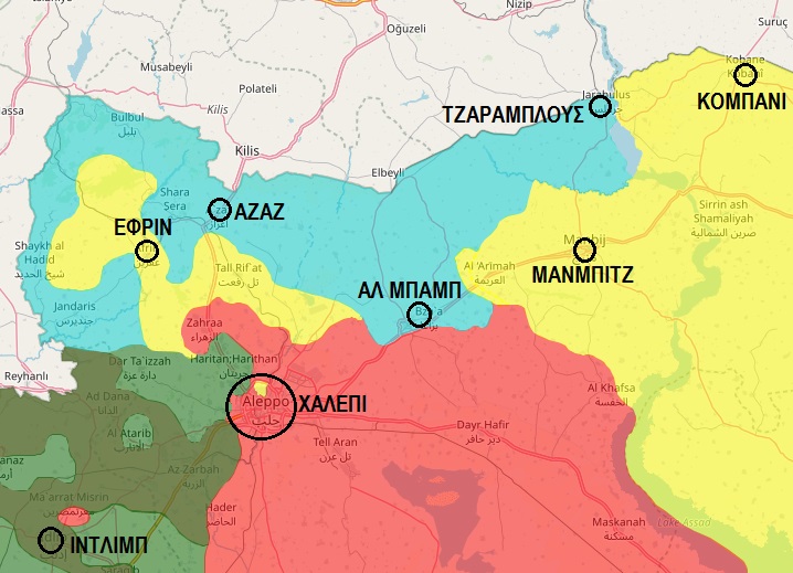 Πολεμικός Χάρτης της βορειοδυτικής Συρίας: Με γαλάζιο χρώμα τα εδάφη υπό τουρκική κατοχή. Με κίτρινο χρώμα τα εδάφη υπό κουρδικό έλεγχο. Με κόκκινο χρώμα τα εδάφη που ελέγχει η κυβέρνηση της Συρίας. Με πράσινο σκούρο απεικονίζονται οι περιοχές της Αλ Κάιντα (Ταχρίρ Αλ Σαμ) και με πράσινο ανοιχτό η Αχράρ Αλ Σαμ και άλλες τζιχαντιστικές οργανώσεις.