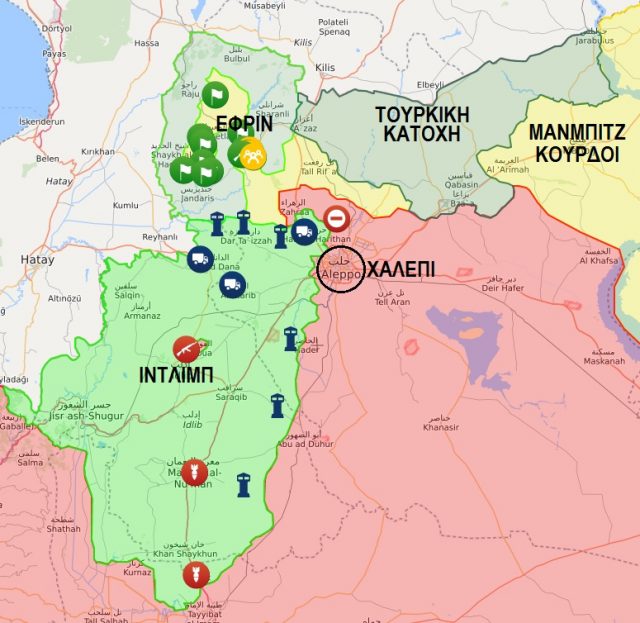 Πολεμικός χάρτης της βορειοδυτικής Συρίας: Οι μπλε πύργοι στον χάρτη είναι τα φυλάκια που έχουν κατασκευάσει οι Τούρκοι. Όπως βλέπετε είναι κατά μήκος των εδαφών που ελέγχει η κυβέρνηση (κόκκινο χρώμα) και οι τζιχαντιστές της Αλ Κάιντα (πράσινο ανοιχτό χρώμα) στην επαρχία της Ιντλίμπ. Είναι εμφανές ότι η Τουρκία προστατεύει τους τζιχαντιστές από τον συριακό στρατό, χτίζει σύνορα. Βορειοδυτικά της πόλης Χαλέπι το εικονίδιο με το φορτηγό δείχνει το σημείο που θα χτιστεί το νέο φυλάκιο. Με σκούρο λαδί χρώμα είναι τα εδάφη που κατέλαβε η Τουρκία στα βόρεια της επαρχίας του Χαλεπιού με την επιχείριση «Ασπίδα του Ευφράτη». Με ανοιχτό λαδί είναι τα εδάφη που έχει καταλάβει στον κουρδικό θύλακα της Εφρίν με την επιχείριση «Κλάδος Ελαίας». Ό,τι βλέπετε στον χάρτη σε αποχρώσεις του πράσινου είναι τα εδάφη που θα ενωθούν υπό τουρκική διοίκηση και εκεί θα δημιουργηθεί το τουρκικό ισλαμιστικό ψευδοκράτος. Οι Τούρκοι θέλουν να πάρουν από τους Κούρδους και την περιοχή της Μανμπίτζ.