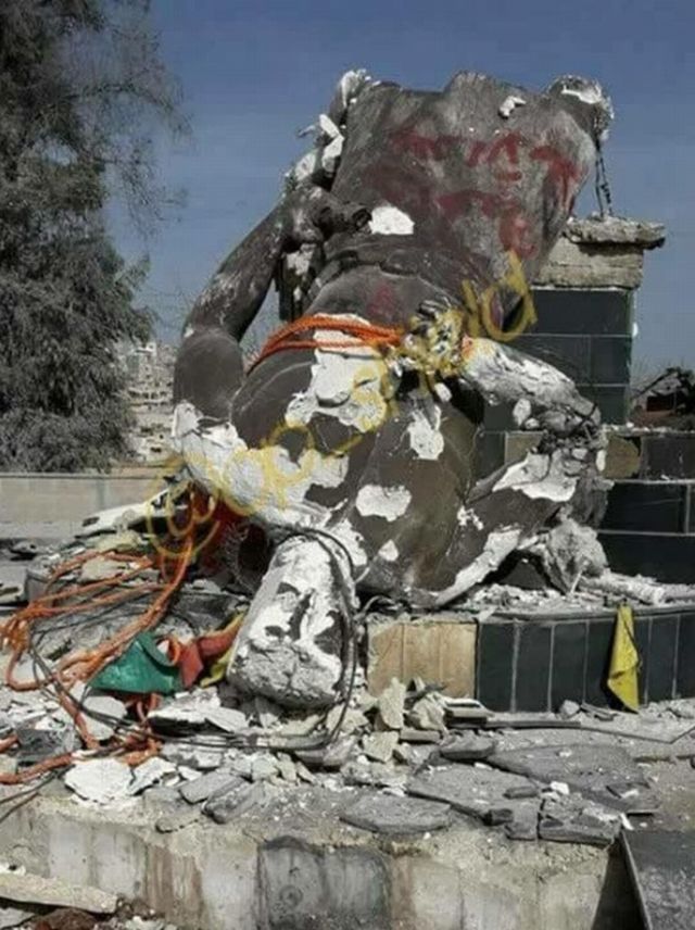 Δείτε τις φωτογραφίες από το γκρέμισμα του ανδριάντα του Κάουα, που μοιάζει με έναν Ήφαιστο-Προμηθέα.