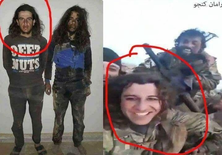 Ο ένας κρανιοφόρος αριστερά στη φωτογραφία, που φορά τουρκική στολή, έχει μακριά μαλλιά που ξεχωρίζουν κάτω από το κράνος. Είναι τζιχαντιστής. Ο δεύτερος μακρυμάλλης φορά μοβ αφγανικά ρούχα. Ρούχα «μόδας Αφγανιστάν» φορά στη Συρία μόνο το Ισλαμικό Κράτος. Δεξιά και ο τρίτος με τουρκική στολή είναι επίσης μακρυμάλλης.