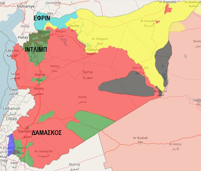 Πολεμικός χάρτης Συρίας: Γαλάζιο χρώμα (τουρκική κατοχή), Κίτρινο χρώμα (Κούρδοι και Σύμμαχοι), Κόκκινο χρώμα (Κυβέρνηση), Μαύρο χρώμα (Ισλαμικό Κράτος), Πράσινο ανοιχτό (Διάφοροι Ισλαμιστές), Σκούρο πράσινο (Αλ Κάιντα).