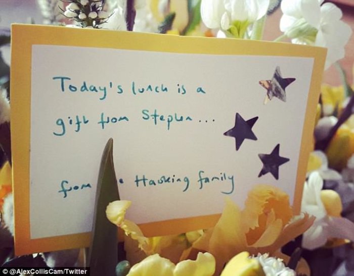 Το δωμάτιο είχε στολιστεί με λουλούδια και στα τραπέζια υπήρχε το μήνυμα: «Το σημερινό γευμα είναι δώρο από τον Στίβεν. Οικογένεια Χόκινγκ».