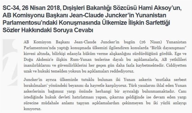 Σε ανακοίνωσή του το τουρκικό υπουργείο Εξωτερικών δηλώνει έκπληκτο από τη δήλωση Γιούνκερ και τονίζει ότι «οι δυο Έλληνες στρατιώτες που παραβίασαν την τουρκική νομοθεσία δεν έχουν κανένα ειδικό καθεστώς απέναντι στην ανεξάρτητη δικαιοσύνη».