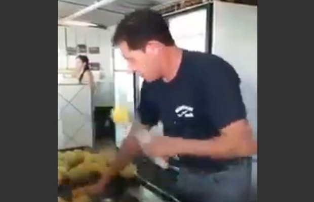 Με το έν χέρι πετάει το λεμόνι και με το άλλο που κρατάει την χατζάρα το τεμαχίζει με ακρίβεια αλλά κυρίως με ταχύτητα.