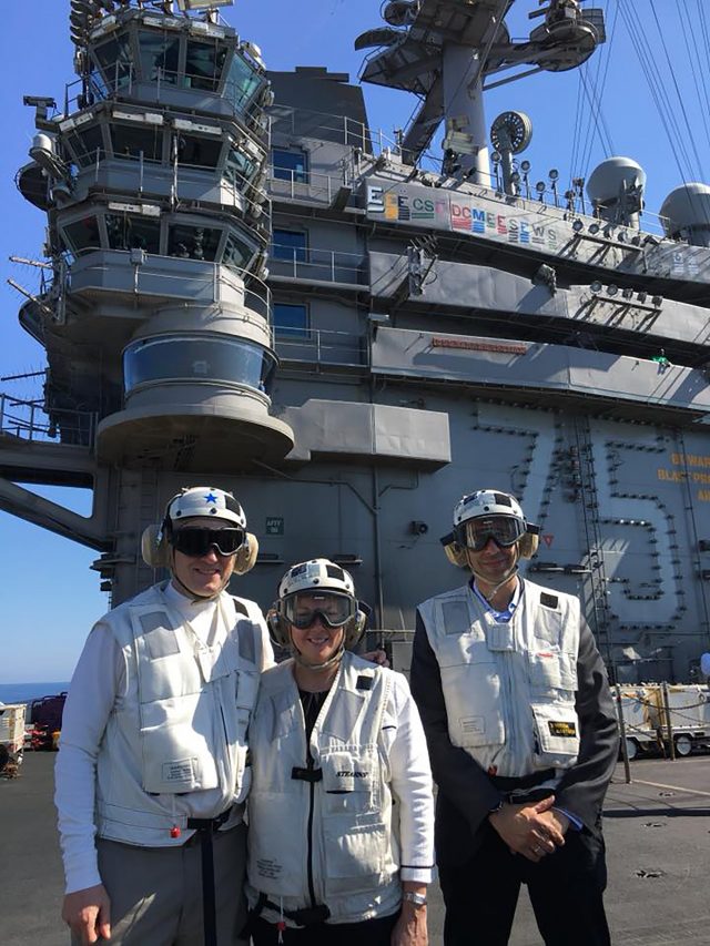 Ο κυβερνήτης του αεροπλανοφόρου, ναύαρχος Νίκολας Ντιένα, ξενάγησε τον υπουργό και τους συνεργάτες του στο σκάφος, το οποίο φέρει το όνομα του 33ου Προέδρου των ΗΠΑ Χάρι Τρούμαν.