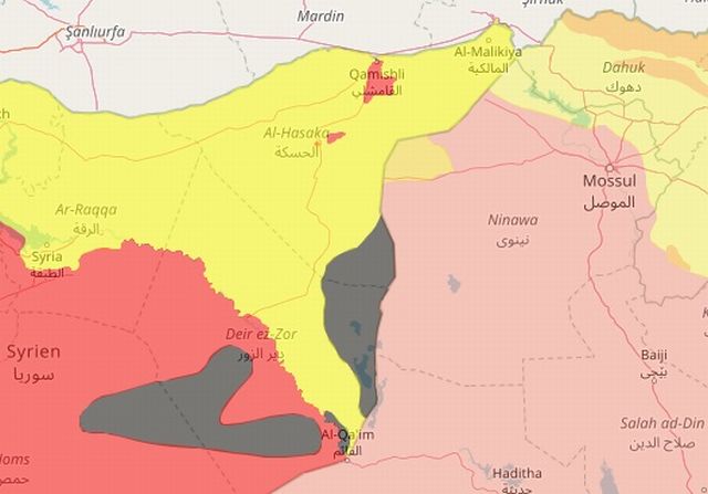 Στον χάρτη που ακολουθεί βλέπετε με μαύρο χρώμα τις περιοχές που ελέγχει το Ισλαμικό Κράτος. Με κίτρινο είναι οι Κούρδοι, με κόκκινο η συριακή κυβέρνηση και με ροζ η ιρακινή κυβέρνηση.