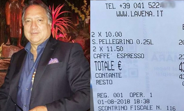 «Δεν ξέρω τι σκέφτεστε, αλλά 43 ευρώ για δύο καφέδες και δύο μπουκάλια νερό!», έγραψε ο Χουάν Κάρλος Μπουσταμάντε, που δεν είχε ενημερωθεί για τις τιμές στην πλατεία του Αγίου Μάρκου.