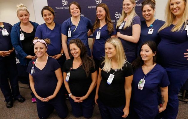 Η εγκυμοσύνη ίσως και να είναι… «μεταδοτική» σε ένα νοσοκομείο στην πόλη Μίσα της Αριζόνα, όπου 16 νοσοκόμες έμειναν σχεδόν ταυτόχρονα έγκυες και περιμένουν εντός των επόμενων μηνών να κρατήσουν στις αγκαλιές τους τα αγγελούδια τους.