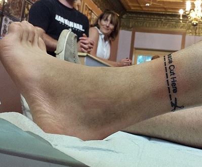 Το πρώτο πράγμα που έκανε ήταν να “χτυπήσει” ένα tattoo χαμηλά πάνω από τον αστράγαλο που έλεγε: “Παρακαλώ κόψτε το εδώ”.
