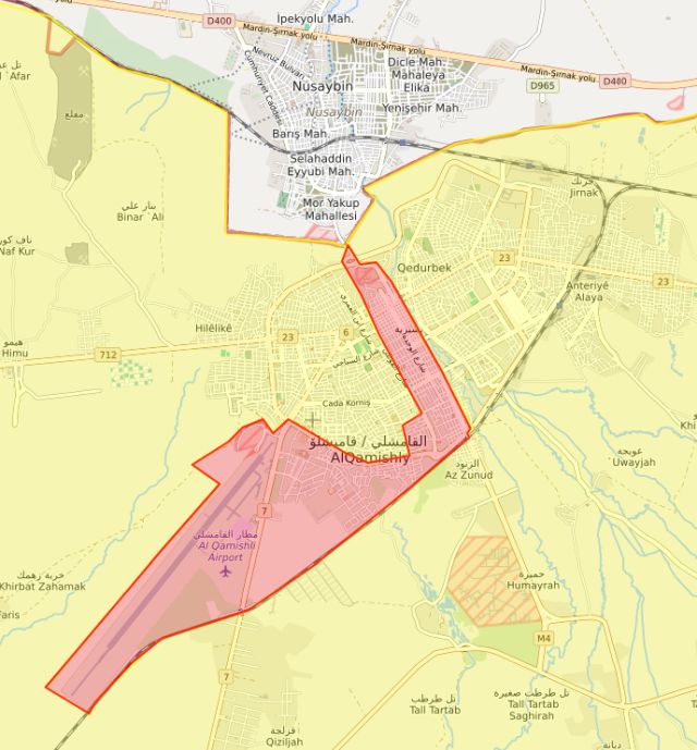 Στον χάρτη της Καμισλί που ακολουθεί, με κίτρινο χρώμα απεικονίζονται οι περιοχές που ελέγχουν οι Κούρδοι και με κόκκινο οι κυβερνητικοί. Αχρωμάτιστη είναι η τουρκική πλευρά των συνόρων, επίσης κουρδική περιοχή:
