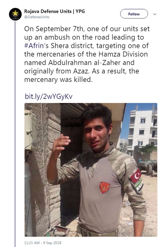 Σύμφωνα με επίσημη ανακοίνωση των YPG, στις 7 Σεπτεμβρίου σκότωσαν σε ενέδρα τον Αμπντουραχμάν Αλ Ζαχέρ, μέλος της Ταξιαρχίας Αλ Χάμζα που αποτελείται από Τουρκμένους της Συρίας, δηλαδή Τούρκους της Συρίας.