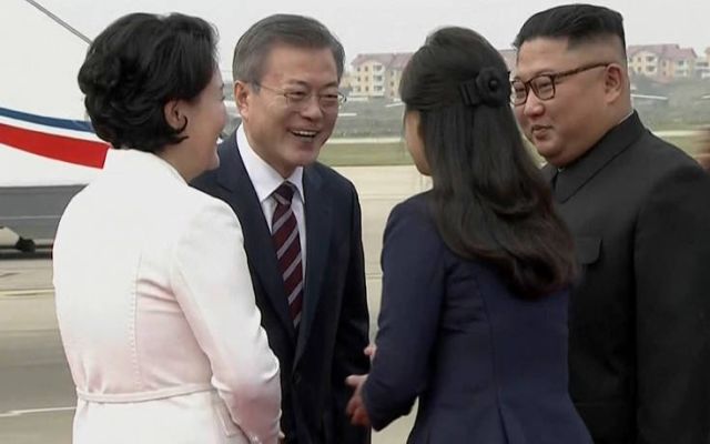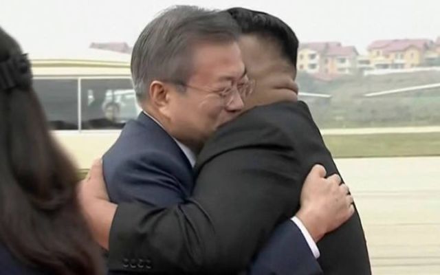 Ο Κιμ υποδέχθηκε προσωπικά τον Μουν στο αεροδρόμιο, τον αγκάλιασε χαμογελαστός και οι δύο άνδρες αντάλλαξαν μερικές φράσεις πριν βαδίσουν πάνω στο κόκκινο χαλί συνοδευόμενοι από τις συζύγους τους, επευφημούμενοι από το συγκεντρωμένο πλήθος.