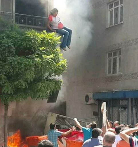 Στην φωτογραφία μπορείτε να δείτε και την γυναίκα που βρίσκεται στον όγδοο μήνα της κύησης που πηδά από το μπαλκόνι σε κατάσταση πανικού.