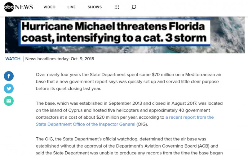 Το αμερικανικό υπουργείο των Εξωτερικών μέσα σε μία τετραετία δαπάνησε περίπου 70 εκατομμύρια δολάρια για μία βάση ελικοπτέρων στην Μεσόγειο και συγκεκριμένα στην Κύπρο.