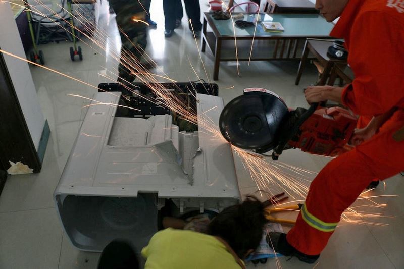 Όπως μπορείτε να δείτε στο βίντεο και τις φωτογραφίες, για τον απεγκλωβισμό του χρειάστηκε η παρέμβαση της Πυροσβεστικής και η ολοσχερής καταστροφή του πλυντηρίου….