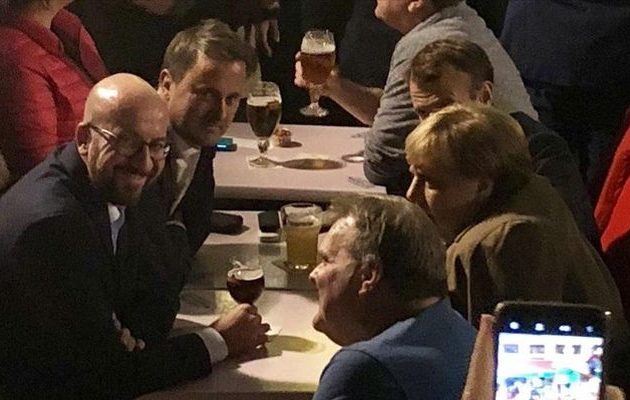 Έπειτα από μία δύσκολη Σύνοδο για το Brexit, η Γερμανίδα καγκελάριος και ο Γάλλος πρόεδρος έσφιξαν τα χέρια τουριστών και ντόπιων και κουβέντιασαν μαζί τους στη γραφική Γκραντ Πλας μαζί με τον οικοδεσπότη τους, τον Βέλγο πρωθυπουργό Σαρλ Μισέλ, και τον Λουξεμβούργιο γείτονά του Ξαβιέ Μπετέλ, ο οποίος είπε πως κέρασε τα ποτά για να γιορτάσει την επανεκλογή του, την Κυριακή, ως πρωθυπουργού.