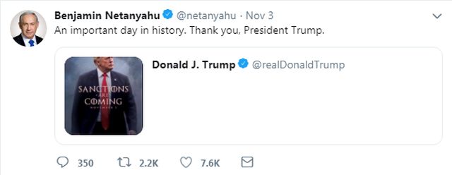 «Ευχαριστώ πρόεδρε Τραμπ για αυτή την ιστορική πρωτοβουλία. Οι κυρώσεις έρχονται στ’ αλήθεια», ανέφερε με εμφανή ικανοποίηση ο Νετανιάχου σε μια ανακοίνωση που δημοσιοποίησαν οι υπηρεσίες του.