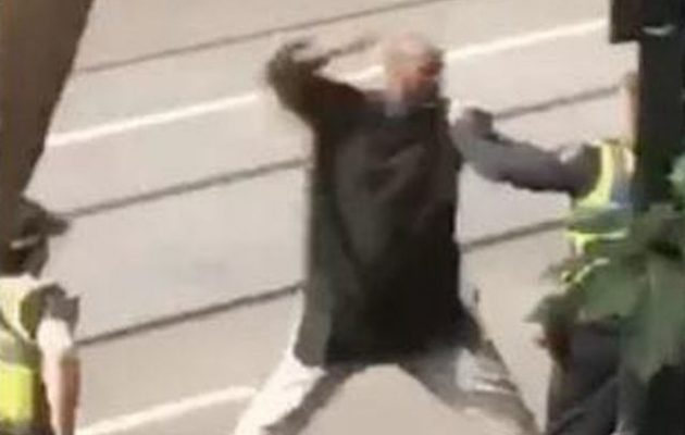 Στο ίδιο βίντεο φαίνεται επίσης ο δράστης να προσπαθεί να τραυματίσει με ένα μεγάλο μαχαίρι τους δύο αστυνομικούς που είχαν σπεύσει στην περιοχή μετά την ειδοποίησή τους για το αυτοκίνητο που καιγόταν, προτού πέσει στη συνέχεια στο έδαφος.