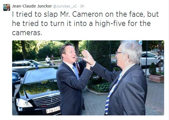Ένας χρήστης που χρησιμοποιεί το όνομα του Ζαν Κλοντ Γιούνκερ στο twitter έκανε το πιο δηκτικό σχόλιο: “Σήκωσα το χέρι να χασκτουκίσω στο πρόσωπο αλλά ο Κάμερον το γύρισε σε “κόλα πέντε” μπροστά στις κάμερες”.