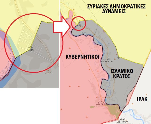 Σύμφωνα με τον πολεμικό χάρτη που σας δείχνουμε, κάτω, οι Συριακές Δημοκρατικές Δυνάμεις έχουν υπό τον έλεγχό τους περίπου τη μισή πόλη Χατζίν (αριστερός χάρτης), που βρίσκεται στα βόρεια του τελευταίου θύλακα της οργάνωσης Ισλαμικό Κράτος στη Συρία ανατολικά του Ευφράτη.