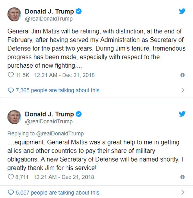 Ο Ντόναλντ Τραμπ ανακοίνωσε, μέσω Twitter, ότι αποχωρεί από την κυβέρνησή του ο υπουργός Άμυνας Τζέιμς Μάτις, τον οποίο ευχαρίστησε για τις υπηρεσίες του.