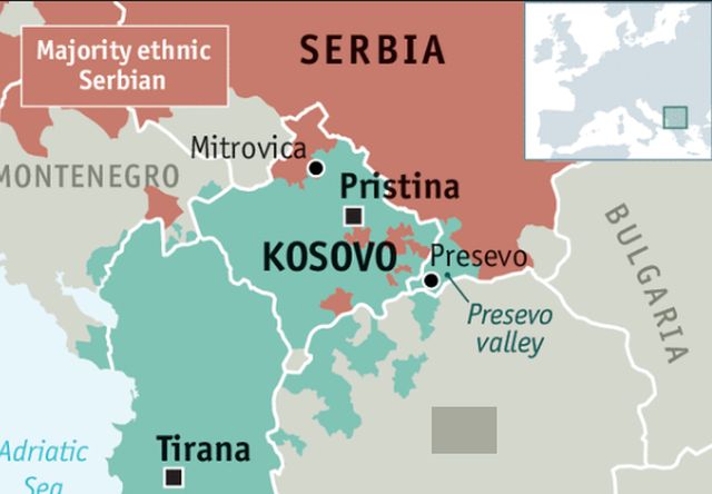 Με το κεραμιδί χρώμα βλέπετε τα εδάφη που πλειονότητα είναι οι Σέρβοι. Με το πράσινο οι Αλβανοί. Σε μια «διόρθωση» συνόρων η Μιτροβίτσα κανονικά θα πρέπει να περάσει στη Σερβία, εάν το Κόσοβο διεκδικεί το Πρέσεβο