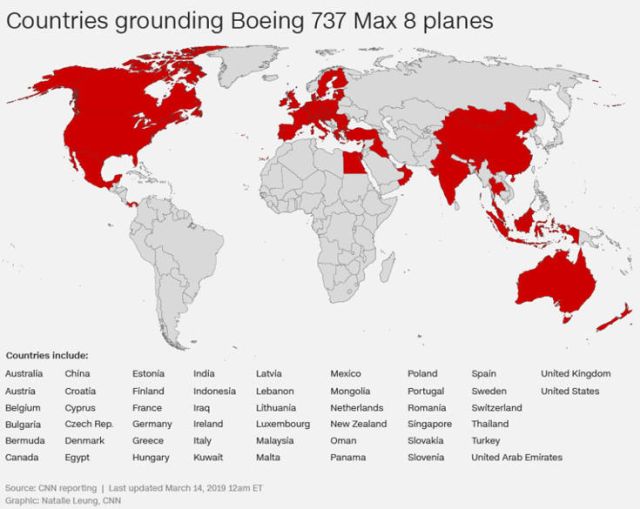 Τουλάχιστον πενήντα χώρες έχουν ήδη καθηλώσει τα αεροσκάφη αυτά ή έχουν απαγορεύσει την πτήση τους στον εναέριο χώρο τους.