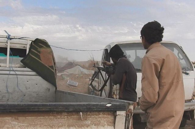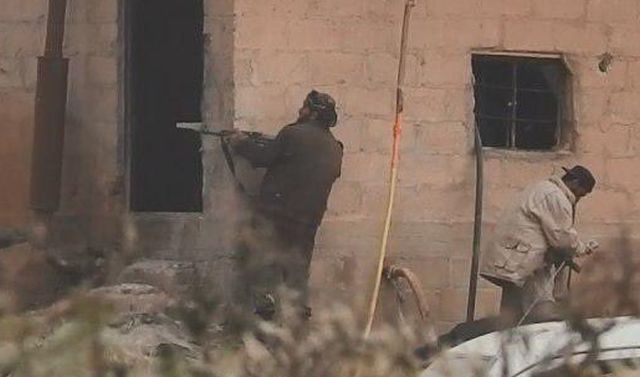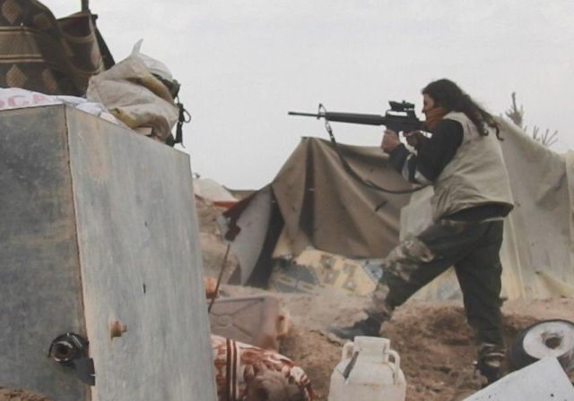 Ένα παιδί, με στολή τζιχαντιστή και οπλισμένο, τρέχει ανάμεσα σε ενήλικες προς την πρώτη γραμμή. Εύκολα διακρίνεται από τη μικροκαμωμένη κορμοστασιά του.