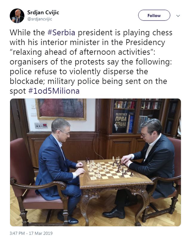 Πάντως, σε μια πρώτη αντίδραση, ο Σέρβος Πρόεδρος κάλεσε τον υπουργό Εσωτερικών να παίξουν ένα παιχνίδι σκάκι, ενώ απ’ έξω η αντιπολίτευση διαδηλώσει.