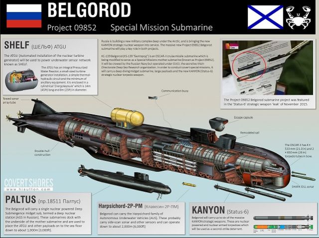 Η Ρωσία πρόκειται σύντομα να αρχίσει τις δοκιμές του πυρηνικού υποβρυχίου «Belgorod», το οποίο, σύμφωνα με ρωσικά ΜΜΕ, θα είναι το υποβρύχιο με το μεγαλύτερο μήκος στον κόσμο- και θα είναι εξοπλισμένο, μεταξύ άλλων, με έξι υποβρύχια drones τύπου «Poseidon», ικανά να φέρουν πυρηνικά όπλα.