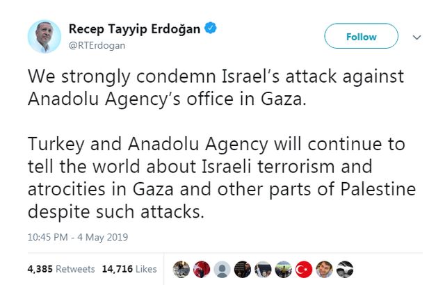 Οι ρουκέτες του Ισραήλ, που ισοπέδωσαν κτίριο στη Γάζα της τζιχαντιστικής οργάνωσης Χαμάς, στο οποίο συστεγαζόταν το τοπικό γραφείο του τουρκικού κρατικού πρακτορείου ειδήσεων Anadolu, θεωρείται από το ισλαμικό καθεστώς της Άγκυρας επιθετική ενέργεια.